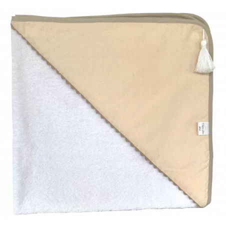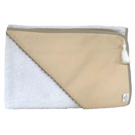 Craquez pour cette magnifique et élégante cape de bain 100 % coton, faite main et made in France. Elle est idéale pour emmitoufler bébé à la sortie du bain, car elle est toute douce et très agréable et elle prendra soin de la peau sensible de bébé, qui est encore fortement exposée aux irritations quand le tissu est agressif. Cette cape de bain est très joliment décorée avec une pièce de tissus plumetis, une bande de croquet et un pompon situé sur le haut de la capuche qui rendra bébé irrésistible.
