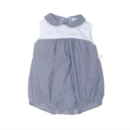 Barboteuse en coton avec détail de liseré aux manches sans manches et au col rond. Elle a des élastiques aux jambes et se ferme avec des pressions invisibles dans le dos et à l’entrejambe.