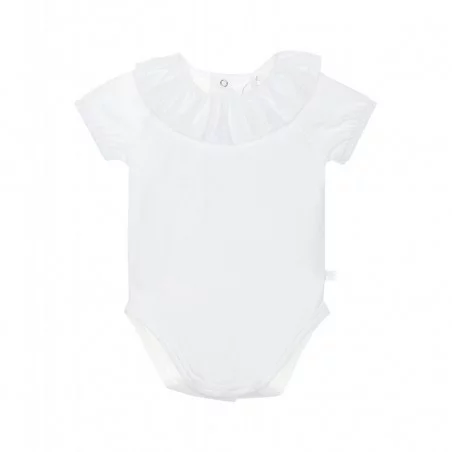 Body volant en maille unie. Col Ă volant en tissu, avec dĂ©tail de broderie et ourlet ouvert sur tout le tour. Fermeture avec des pressions dans le dos et Ă l’entrejambe. Ce Body Volant comblera petits et grands.