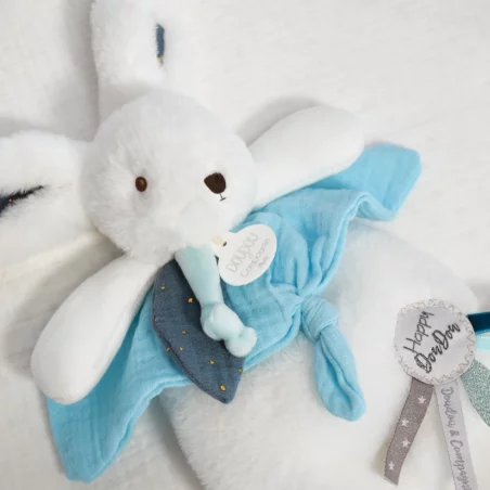 Le Doudou Happy Pop, de la marque Doudou et Compagnie est extrĂŞmement doux et tendre, travaillĂ© façon haute couture. StylĂ©, tendance « mix and match », avec son pompon bleu. C’est cadeau de naissance idĂ©al.