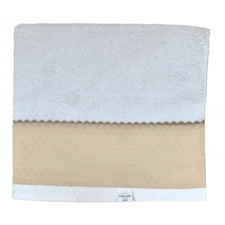 Craquez pour cette Ă©lĂ©gante serviette de bain ornĂ©e d’une bande de tissus plumetis et d’une bande de croquet. 100 % coton, elle est d’une douceur extrĂŞme et très agrĂ©able au toucher, donc parfaite pour emmitoufler bĂ©bĂ© Ă la sortie du bain sans lui irriter la peau. Faite main et made in France, c’est un cadeau idĂ©al dès la naissance.
