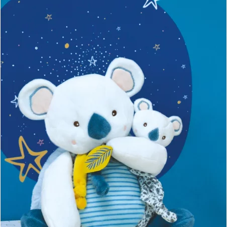 Voici une jolie maman koala aux couleurs très tendance et des matières toujours plus douces. Elle est accompagnée de son bébé et d’un anneau de dentition.